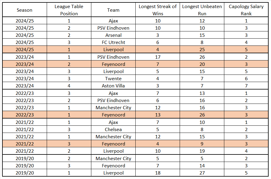 All wage data in football has to be taken with an unhealthy dose of salt. The salary standing of Manchester City in the next table suggests as much. It shows the teams in England and Netherlands that have not lost more than one league game in a row in the five full campaigns Slot has had in management, sorted by their wage rank within their league.