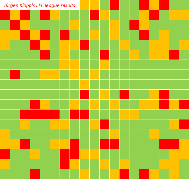 Long-time followers may recall a simple chart I made for my own amusement back in the early days of the Klopp era. A basic colour coding system a child would devise illustrated that he had not lost consecutive league matches with Liverpool. That run ended eventually, as such runs always do, but it took until match 205, which is more league games than Slot has accumulated in his career.