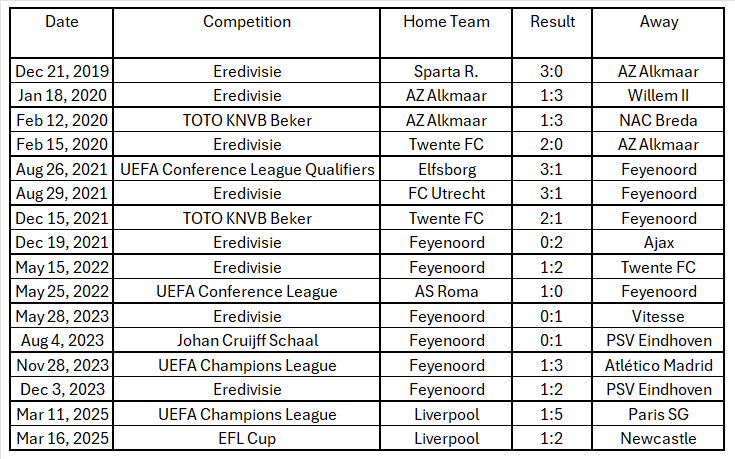 Thankfully this unfortunate incident occurred over five years ago. Below is a table of the instances in which Slot has suffered defeats in two straight games in all competitions.