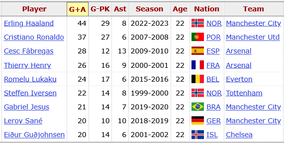 The 22-year-old Premier League freshman from overseas who came closest to hitting the list is Nicolas Jackson, with 19 non-penalty contributions two seasons ago. Below him we find Javier Hernández and Mohammed Kudus on 14, with Massimo Maccarone and Sadio Mané one further back. Senegal’s young attacking talent clearly prospers in English football.
