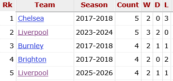 The worst individual performance was delivered by Mohamed Salah at Manchester City. He became the only player to be flagged offside four times in a Premier League match for any club so far this season. It is Cody Gakpo who has been the most frequent offender overall though.