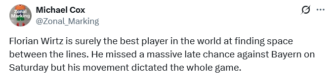Wirtz has been in such spaces in his new red shirt. A Sky Sports piece published early in the campaign which primarily highlighted his running power gave examples of his off-ball movement. He drags opposing players out of position to create space in which his teammates can either flourish or potentially find him with a pass.