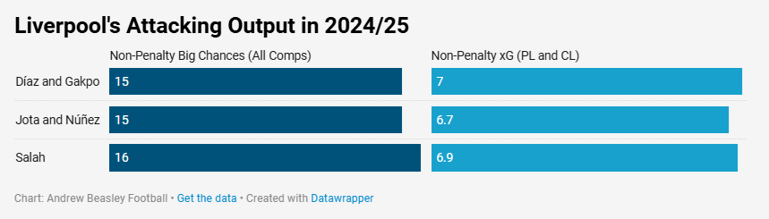 Arne Slot has made the composition of his front line largely clear. Díaz and Gakpo share the left side, Jota or Núñez plays through the middle and - barring the emergence of Federico Chiesa - Salah takes care of business on the right. Even though the goal totals they provide inevitably fluctuate, the underlying statistics are remarkably consistent across the trio of positions.