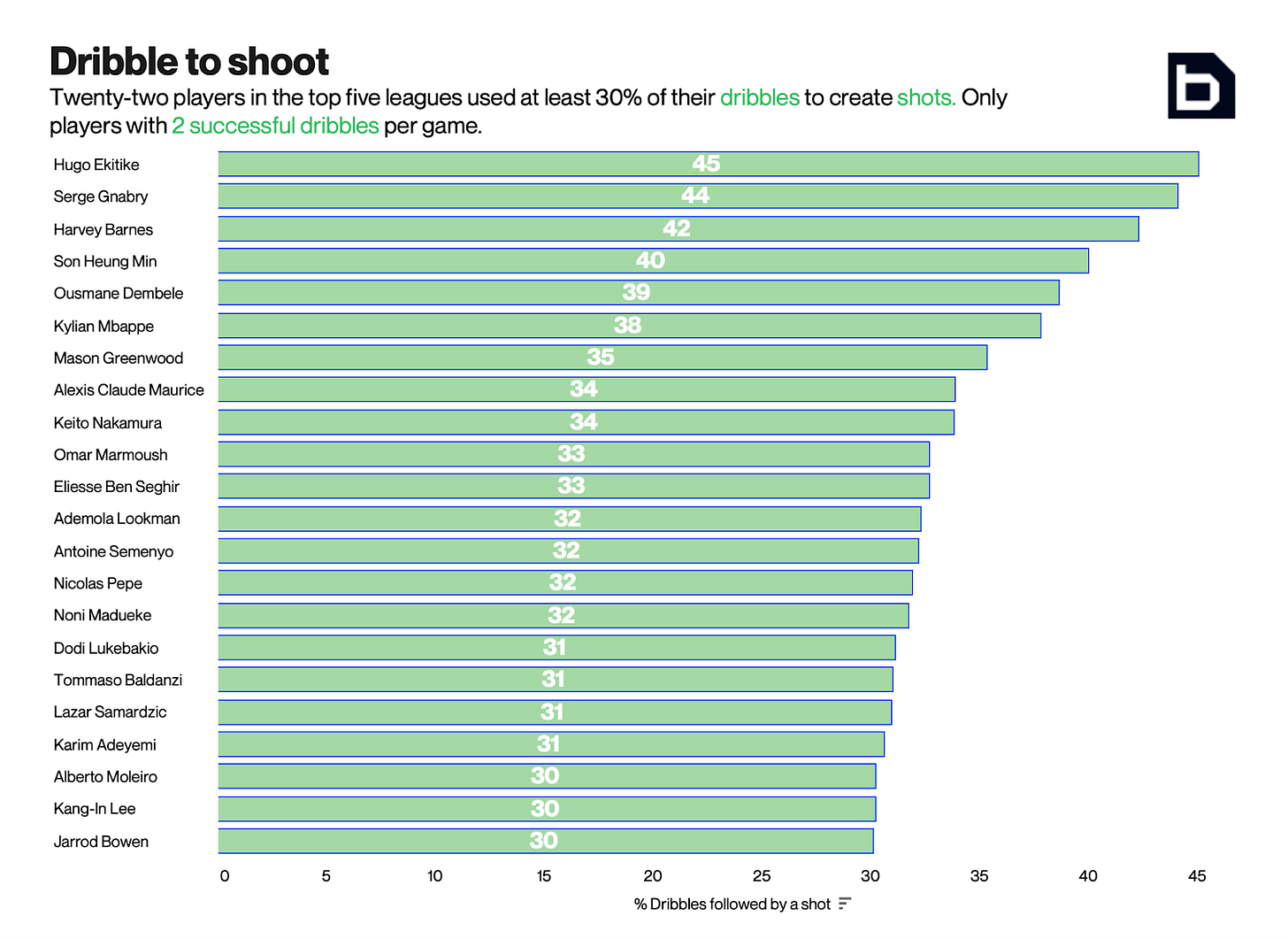 Fear not, he undoubtedly can, even if his standing is not quite as elite as it is for productive ball carries. Driblab recently highlighted that he led the big five leagues for proportion of dribbles used to create shots, albeit they did not specify if this meant dribbles in the Opta sense or ball carries (in the, um, Opta sense).