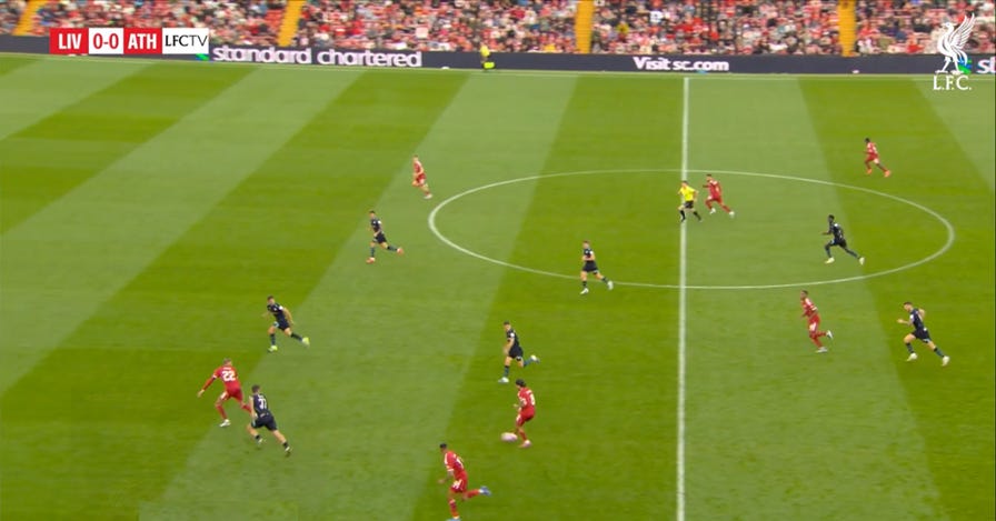 A better example of the Frenchman’s dribbling prowess occurred in the friendly victory over Athletic Club. Running onto the pass from Dominik Szoboszlai pictured below, the number 22 carried the ball to just shy of the byline. He then pulled it back centrally to assist Salah for the opener.