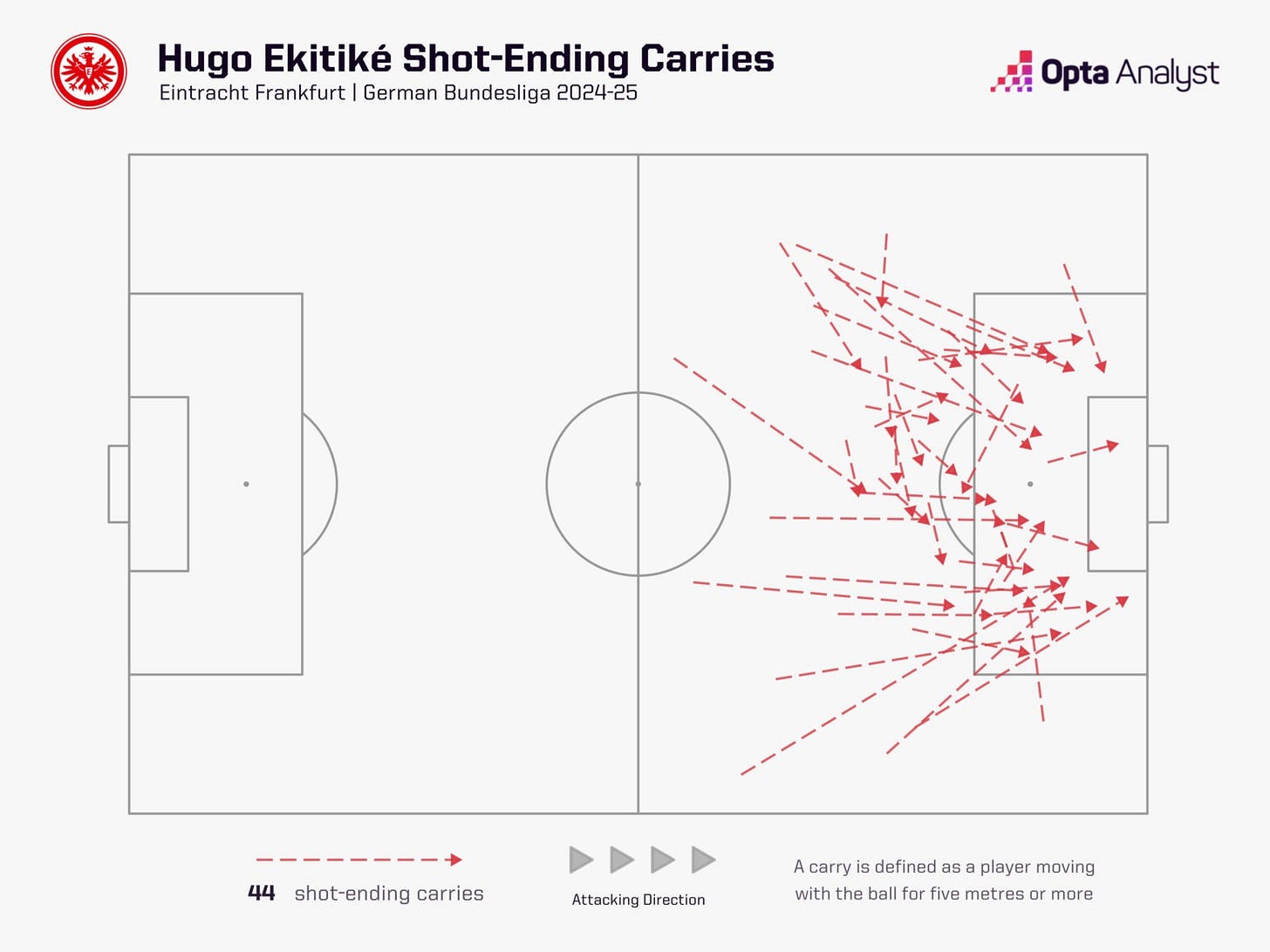 Hugo Ekitike finished fourth in the 2024/25 Bundesliga for carries into the opposition penalty area, with 52. He was one behind a Leverkusen attacking midfielder called Florian Wirtz.
