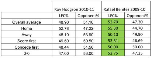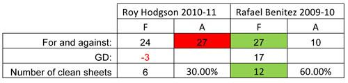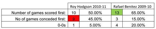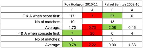 Benitez’s team scored (on average) just over two goals a game when they scored first, which goes a long way to explaining why they won on ten of the thirteen occasions that this happened. Hodgson’s side conceded an average of over two goals whenever they conceded first, and this clearly contributed to the eight defeats from nine matches (the recent Bolton game stopped a complete whitewash of nine defeats on this front). A clear shift in defensive and offensive success had occurred, and if nothing else, this proves just how vital the first goal in the majority of matches is.