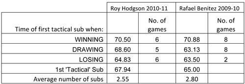 There isn’t necessarily a better or worse time to make a substitution, but the real issue here is one of media consistency. Rafa made more changes and made them earlier on average, yet you never hear accusations of Roy ‘managing by numbers’ or suchlike. I had to smile when I saw that Rafa’s average time for his first tactical substitution across these twenty games was sixty-five minutes, the exact time that Andy Gray et al accuse him of working to. So please don’t tell anyone at Sky what I’ve found!