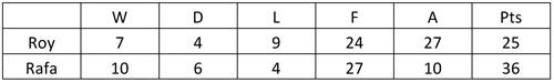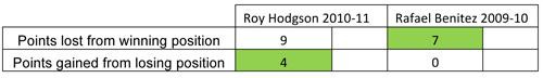 Whilst Roy did recover four points from losing positions to Rafa’s zero, he did have eleven occasions (the nine where we conceded first, plus Sunderland at home and Tottenham away) to attempt and save the game to Rafa’s three, so it isn’t too much to be proud of. For the record, Rafa’s team lead in thirteen matches to Roy’s eleven.