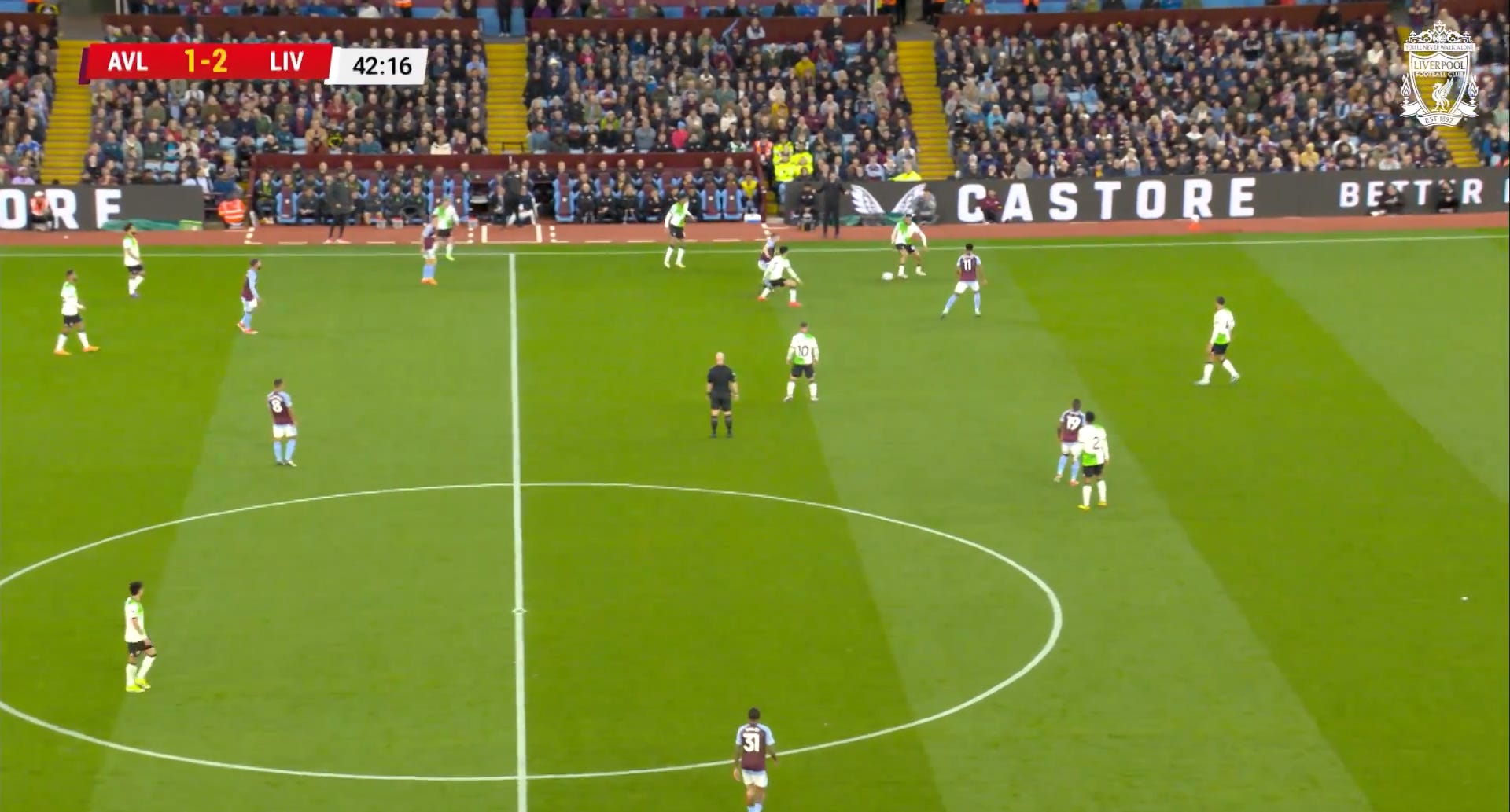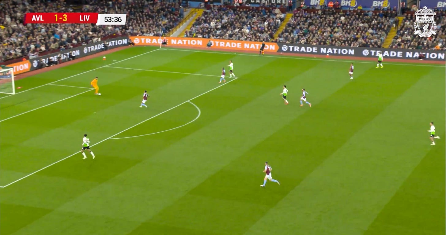 His mistake on Monday was not the worst but it highlighted a problem with Liverpool’s structure which Villa’s first goal had also proved. Below is a screenshot of Alexander-Arnold’s goof, a misplaced pass in the middle third of the pitch. One John McGinn pass later and Moussa Diaby was clean through on goal. As with Alexis Mac Allister’s failed through ball for the first equaliser, it shouldn’t be so easy for the opposition to have a big chance or score following a routine turnover so far from your own goal.