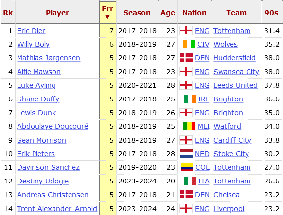 Let’s review them in chronological order. The first Red to err was Trent Alexander-Arnold, and he has form. He became just the 14th outfield player since 2017/18 to make at least five Opta errors in a Premier League season, and nobody has hit this unwanted mark when playing fewer minutes.