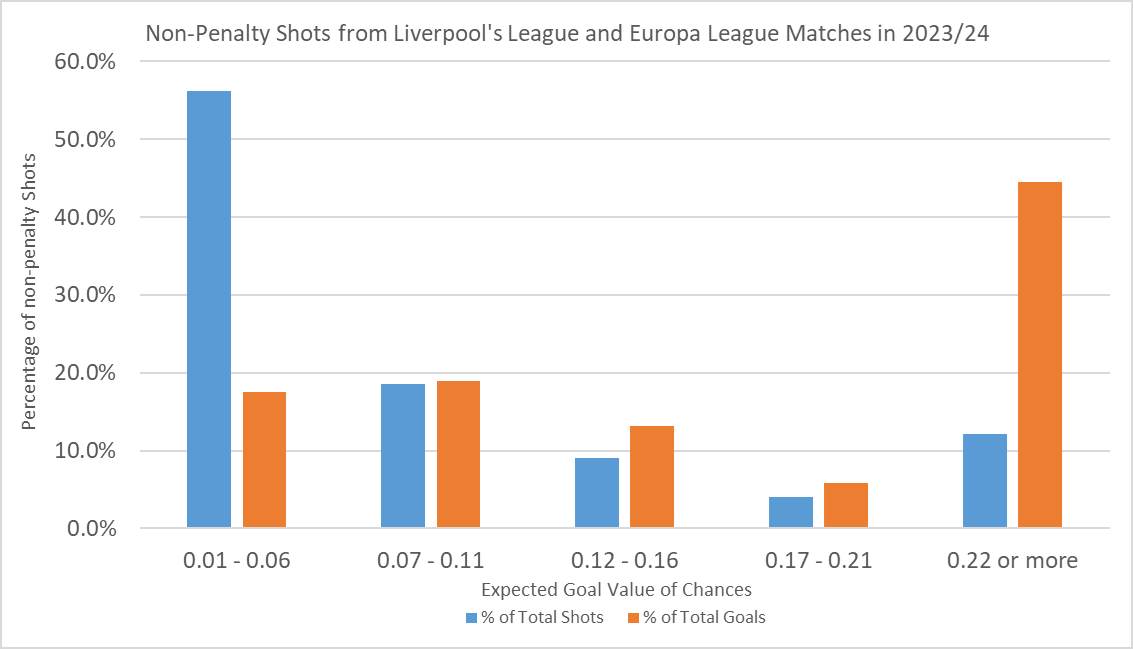 Here’s some numbers to put that into context. There were over 800 shots in Liverpool’s league and European matches last season which were worth just 0.06 expected goals at most. These low value efforts accounted for 56.3 per cent of the non-penalty shots but only 17.5 per cent of the goals.