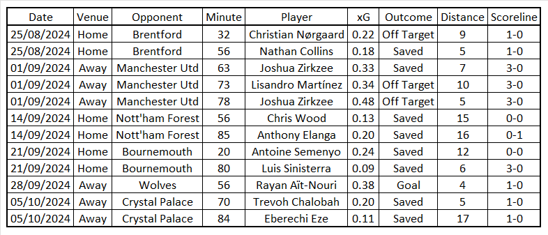 That leaves us with two. Antoine Semenyo saw a big chance saved at 0-0 in the home win over Bournemouth, which also came from an error, with the other example being the aforementioned Eze effort. Adding the expected goal value of these two chances together still totals less than the average xG for an Opta big chance.
