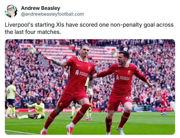 Since the summer of 2014, there have been just shy of 2,500 Premier League matches won by a team that scored at least twice. Newcastle’s Wembley victory was achieved with just 143 completed passes, which would be just outside the top 20 fewest from that enormous sample. Looking at the Reds’ entries around that mark will give you flashbacks, bad dreams, night sweats and a mild-to-medium sense of dread.