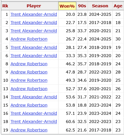 Over the years, Andy Robertson has acquitted himself in the air with better results than his full-back colleague. The Scot has seen a significant dip in 2024/25, though, with Newcastle taking full advantage under the Wembley arch as Murphy headed back to Alexander Isak for the 25-year-old to score against Liverpool as usual.