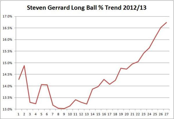 Using data from www.eplindex.com, I thought it'd be interesting to investigate what percentage of passes that Steven Gerrard has played long this season. The trend makes for interesting viewing: