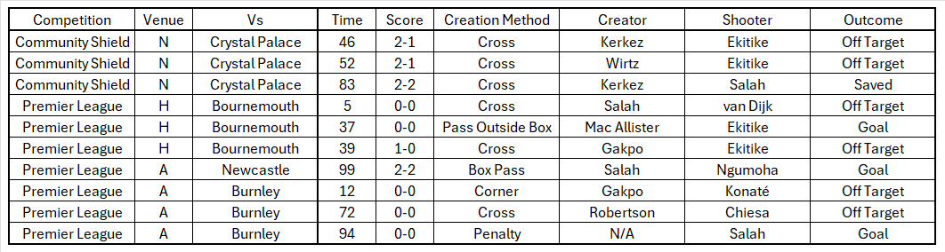 There have only been two exceptions. The first saw Hugo Ekitike bundle his way into the Bournemouth box, enjoying a favourable run of the ball. The other, while technically not a cross, was a pass from the edge of the area towards the far side of it. If it looks like a cross and smells like a cross, it’s probably a cross.
