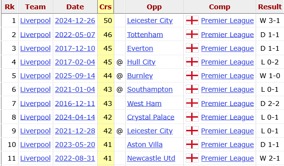 While the FBRef database doesn’t go back to those dark days, it has remained rare for the Reds to win if attempting over 40 crosses. This was one of two of the three victories in the 11 league game sample which needed a stoppage time winner.