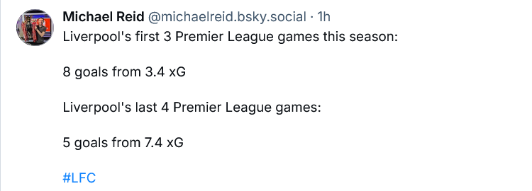 Liverpool have now lost three successive matches; two to injury time goals, the other to the softest penalty you’ll probably see all season. But then they won several games early in the campaign thanks to striking late too. We could very feasibly be in the position of the Reds having drawn six of their seven league matches in 2025/26.