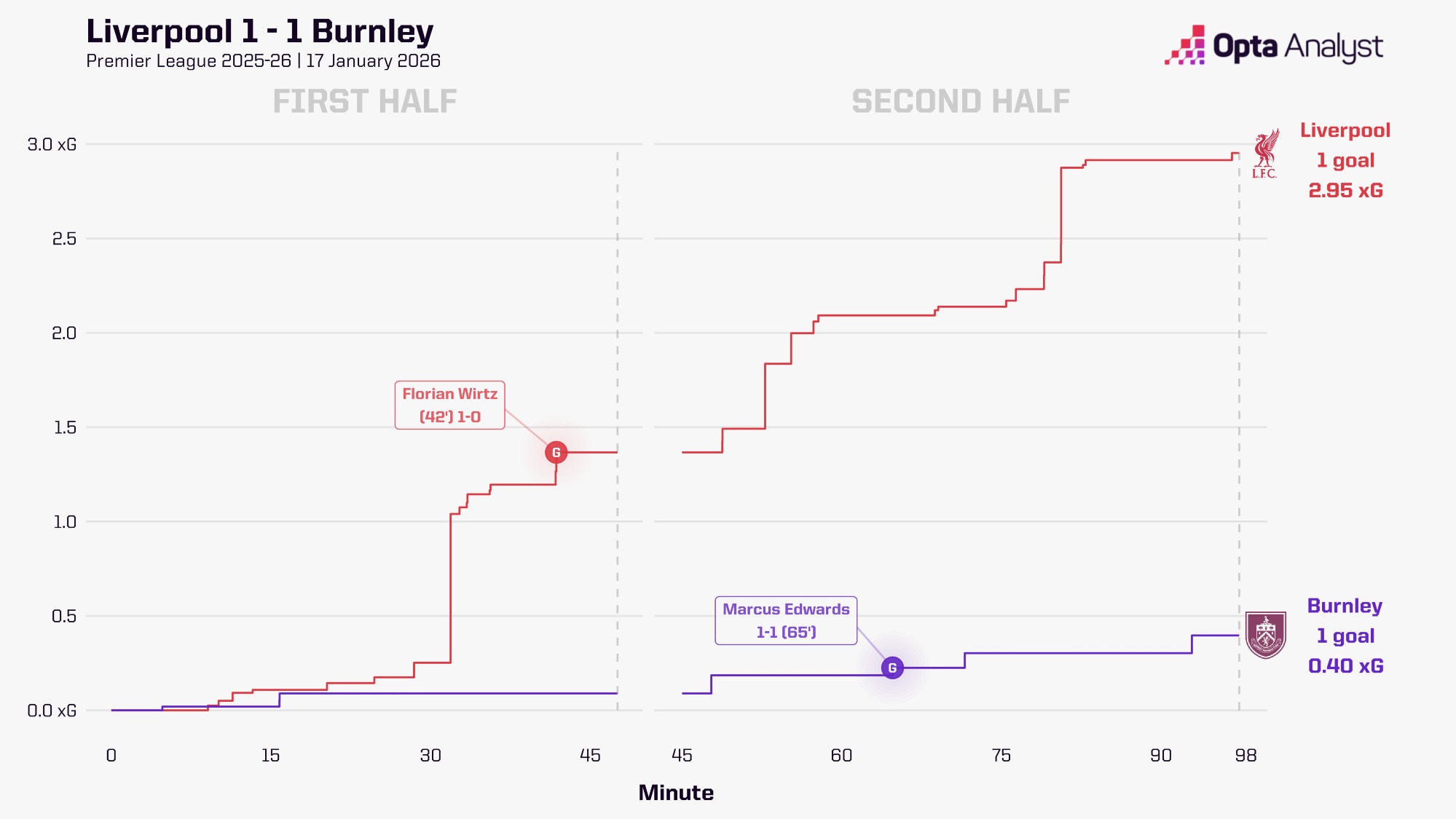 The Reds had 57 non-penalty shots against Burnley this season. These efforts resulted in one goal.