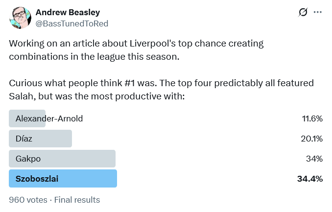 The latter two duos produced little of note, with neither generating more than a single shot on target. Luis Díaz and Alexis Mac Allister - the likeliest combination in this group to feature next season - did at least fashion two chances worth 0.10 expected goals, whereas Alexander-Arnold and Dominik Szoboszlai failed to deliver anything above 0.07 xG.