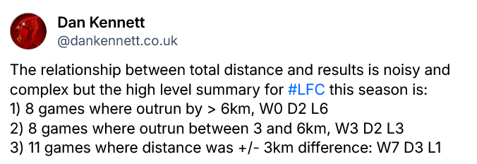 The physical data should not be dismissed entirely. A recent Bluesky post by Reds fan Dan Kennett showed there has been some correlation between the extent to which Liverpool’s opponents have logged more distance and their results this season.