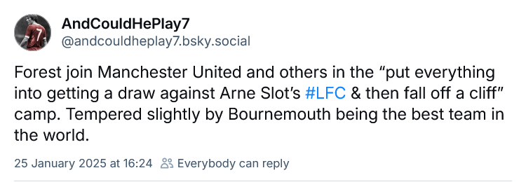 The above post was shared when Bournemouth were on their way to beating Nottingham Forest 5-0 last weekend. Does playing Arne Slot’s Liverpool drain a team? The opposition will have been killed with passes if the Reds’ head coach got his way. They will likely have faced more shots than average based on the statistics for this season too. Defending is tiring.