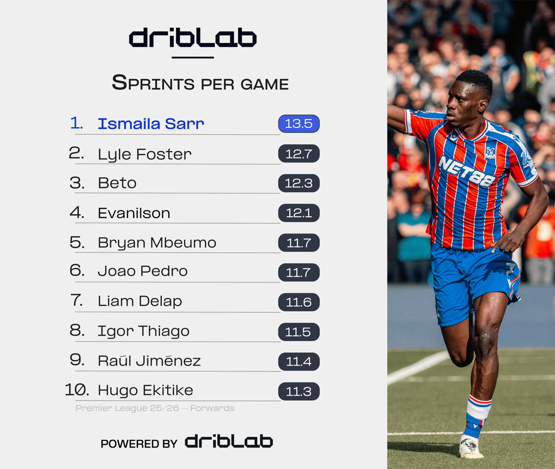 We can see that Hugo Ekitike averages 11.3 sprints per league game. Yet based on the below figures from a Sky Sports article that was published earlier the same week, Liverpool’s number 22 had averaged 11.9 per match.